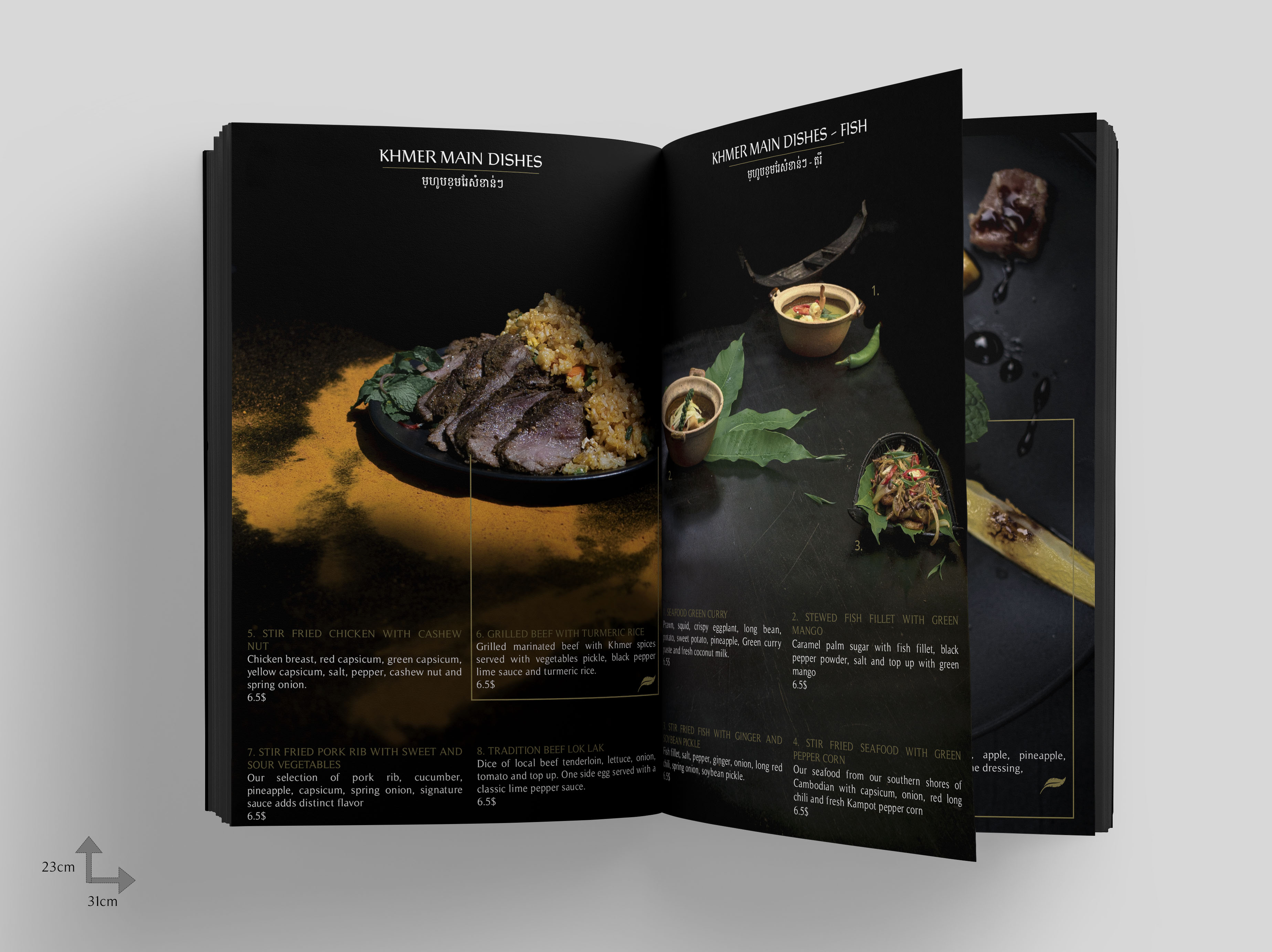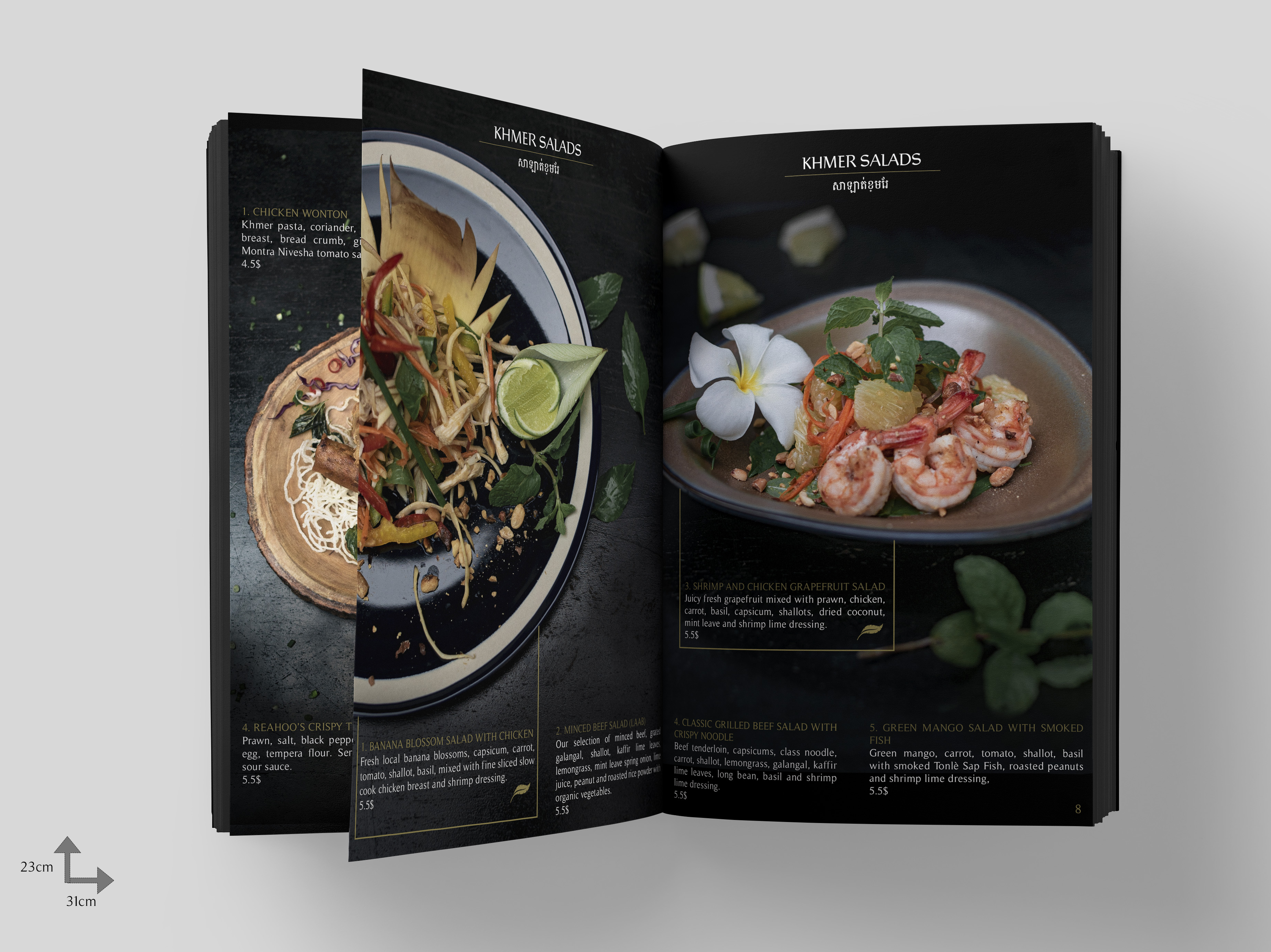 The logo is a luxury style logo and the leaf comes as a symbol of Nature and natural products used in the restaurant. For the menu, I took the pictures of the different dishes according to the style I wanted to have, in other words on a black background to give full attention to the food. Using the pictures, I created the menu in a modern style, keeping the golden touch of the logo.